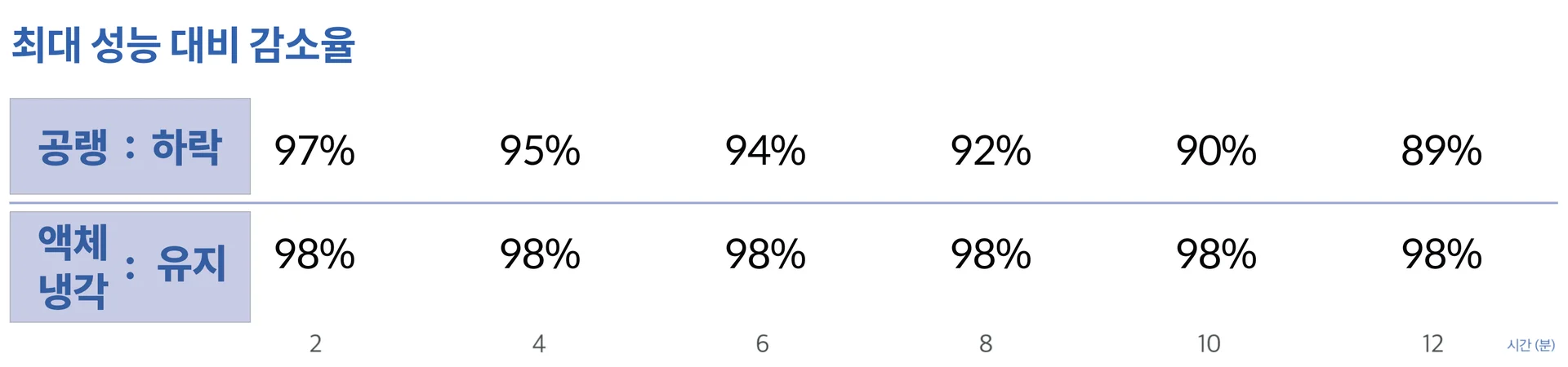 공랭의 경우 시간이 지남에 따라 성능이 계속해서 하락하며, 자발적 성능 제한(throttling)이 일어날 경우 최대 50%까지 떨어질 수 있습니다.